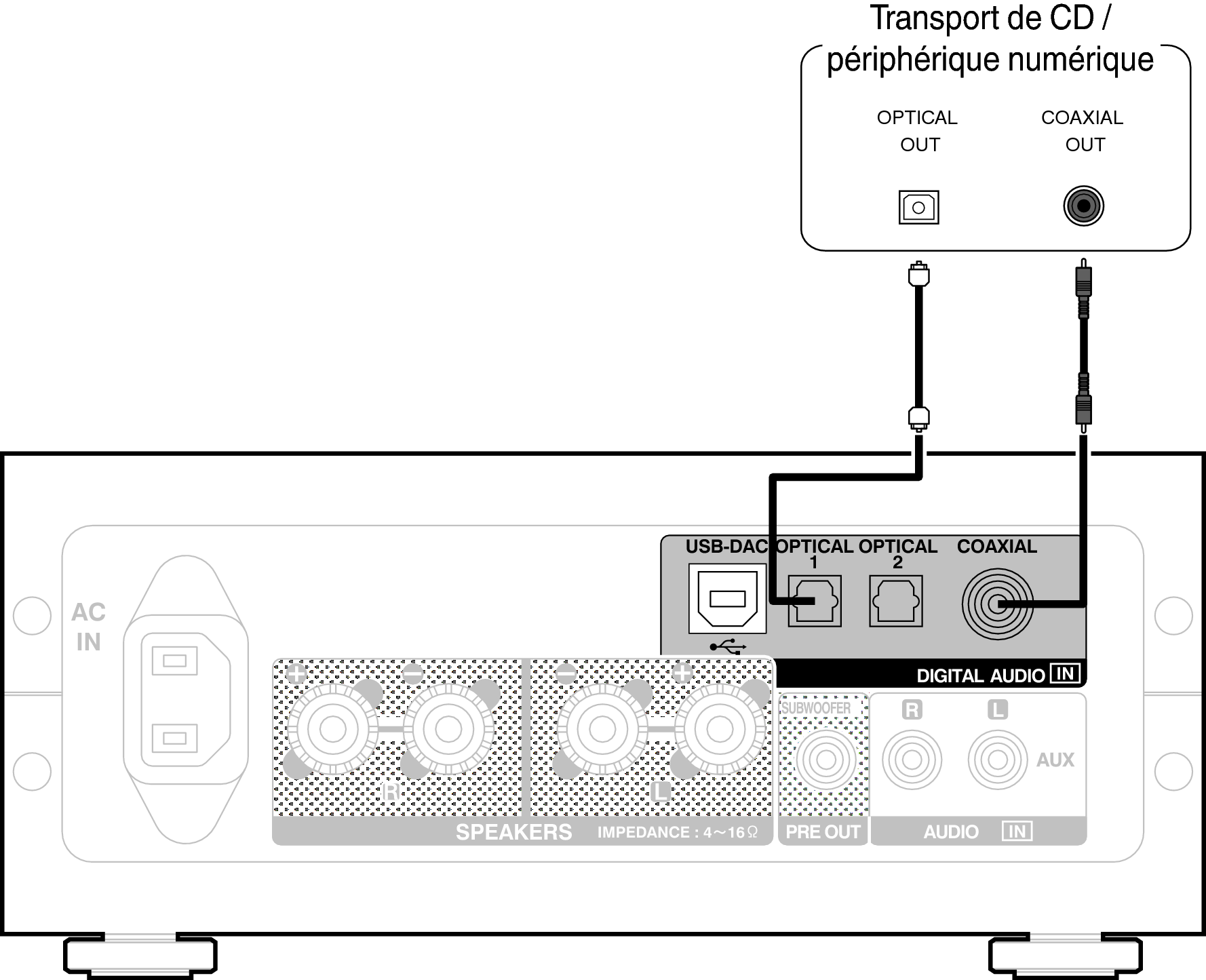 Utiliser cette connexion pour entrer les signaux audio numériques à cet appareil, et convertir les signaux de la lecture avec le convertisseur N/A de cet appareil. lien