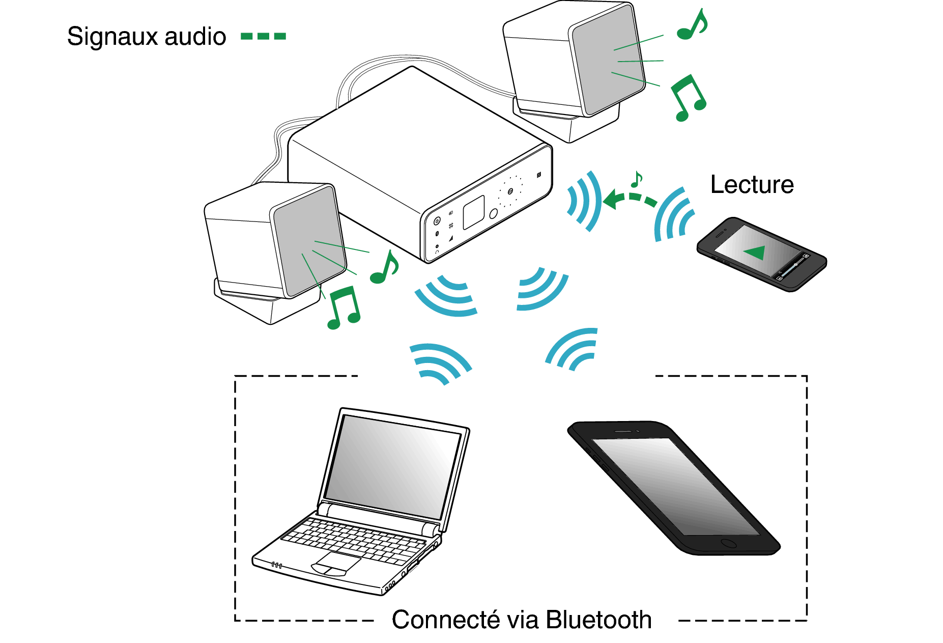 Les enceintes émettent la musique que le périphérique Bluetooth est en train de lire.