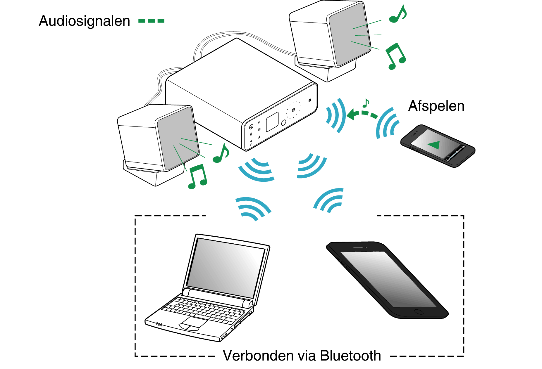 De luidsprekers voeren muziek uit vanaf het Bluetooth-apparaat.