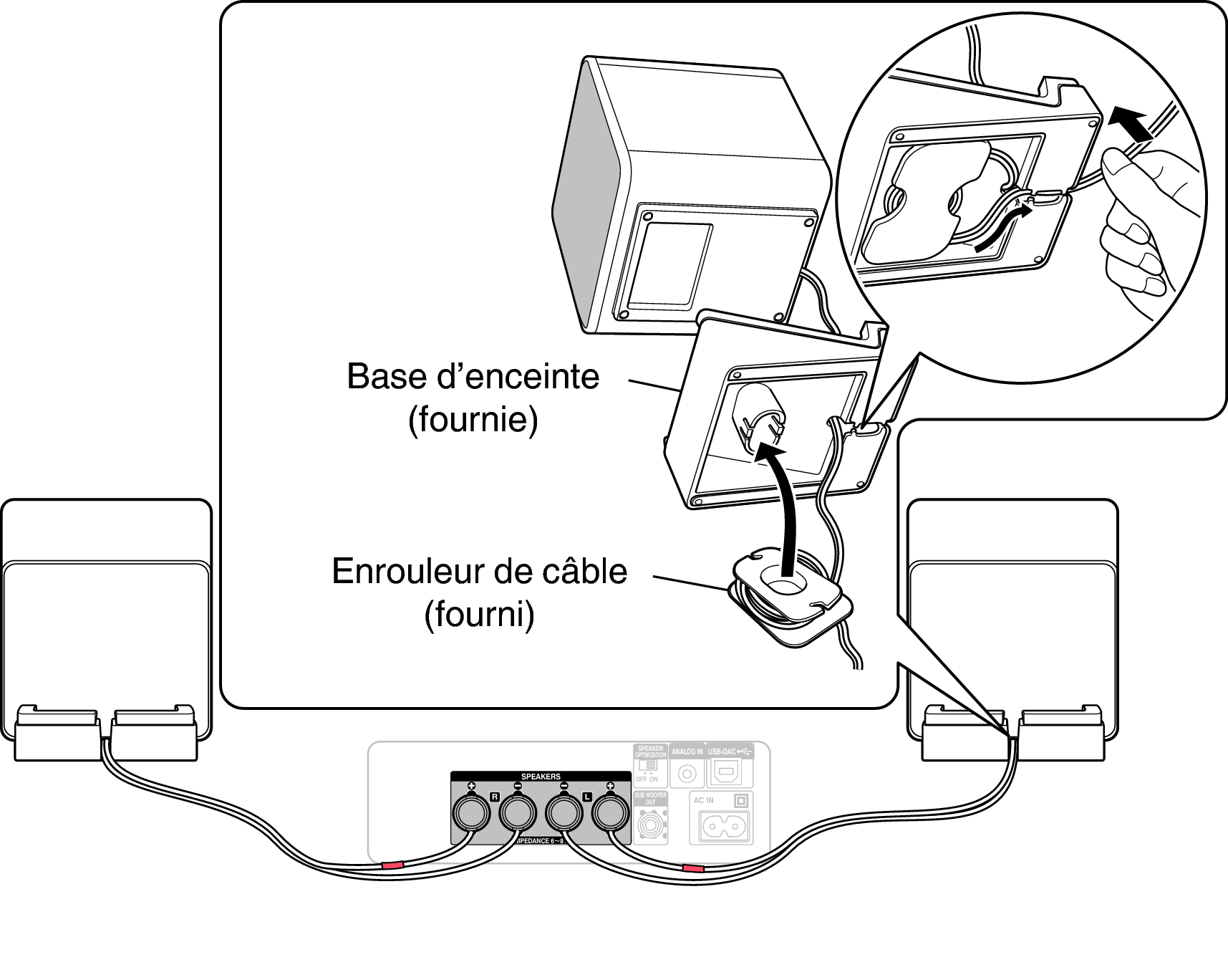 Vous pouvez utiliser l’enrouleur de câble afin d’enrouler le câble d’enceinte relâché pour des connexions organisées. Les enrouleurs de câble sont stockés sous les bases d’enceintes au moment de l’expédition.