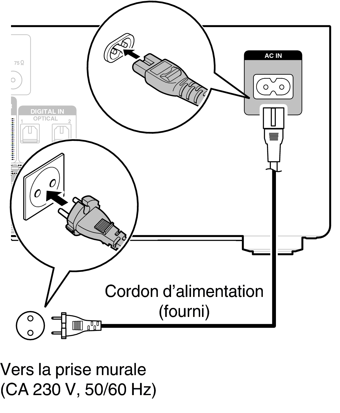 Une fois toutes les connexions effectuées, insérez la fiche d’alimentation dans la prise murale.