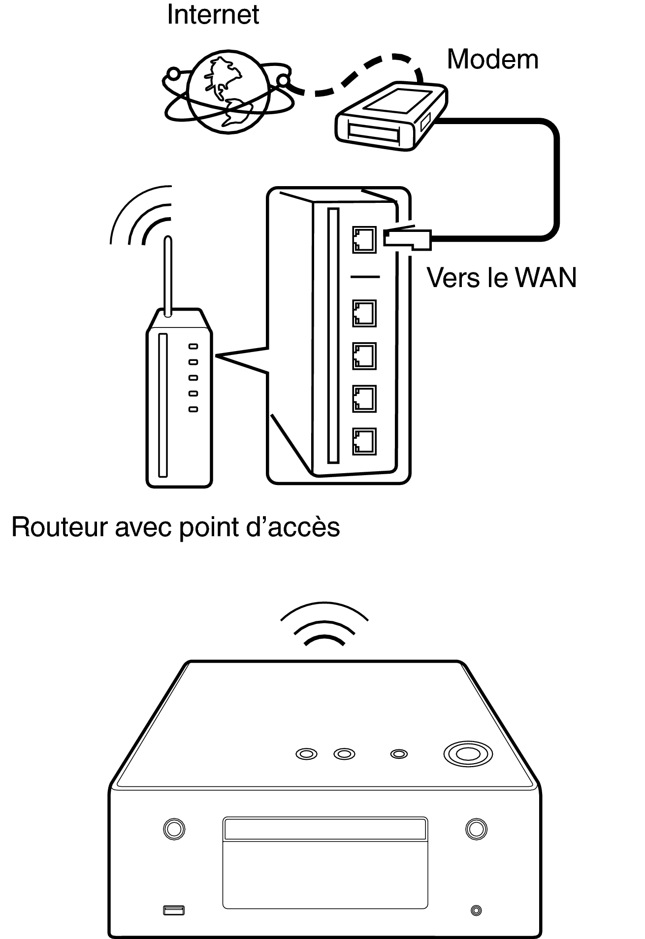 Lorsque vous utilisez un routeur compatible WPS (Wi-Fi Protected Setup), vous pouvez facilement vous connecter au Wi-Fi en appuyant sur la touche Wi-Fi CONNECT/WPS sur cette unité. (Reportez-vous au “Quick Setup Guide” fourni séparément.)