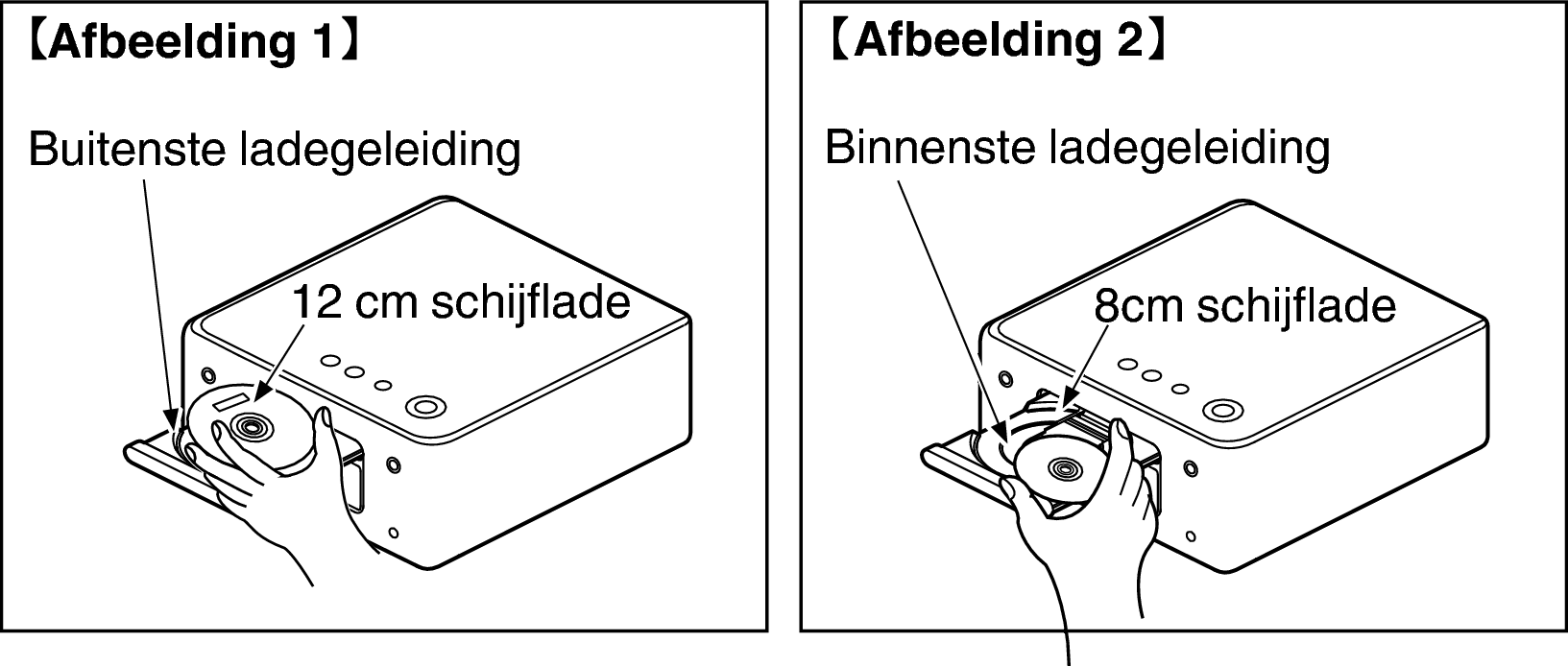 Leg de schijven plat, 12 cm schijven in de buitenste ladegeleider (afbeelding 1), 8 cm schijven in de binnenste ladegeleider (afbeelding 2).