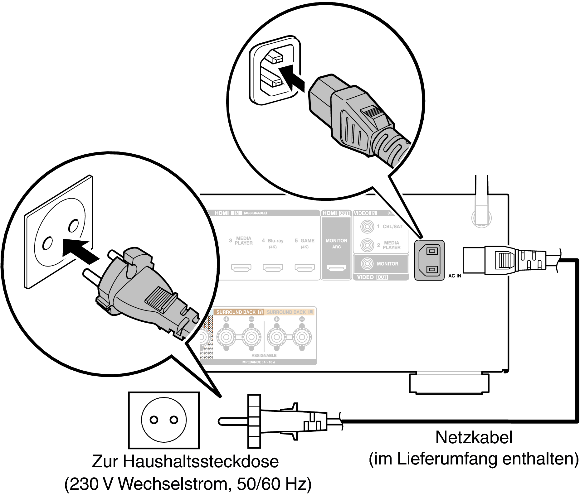 Wenn alle Anschlüsse hergestellt wurden, schließen Sie den Netzstecker an die Steckdose an.