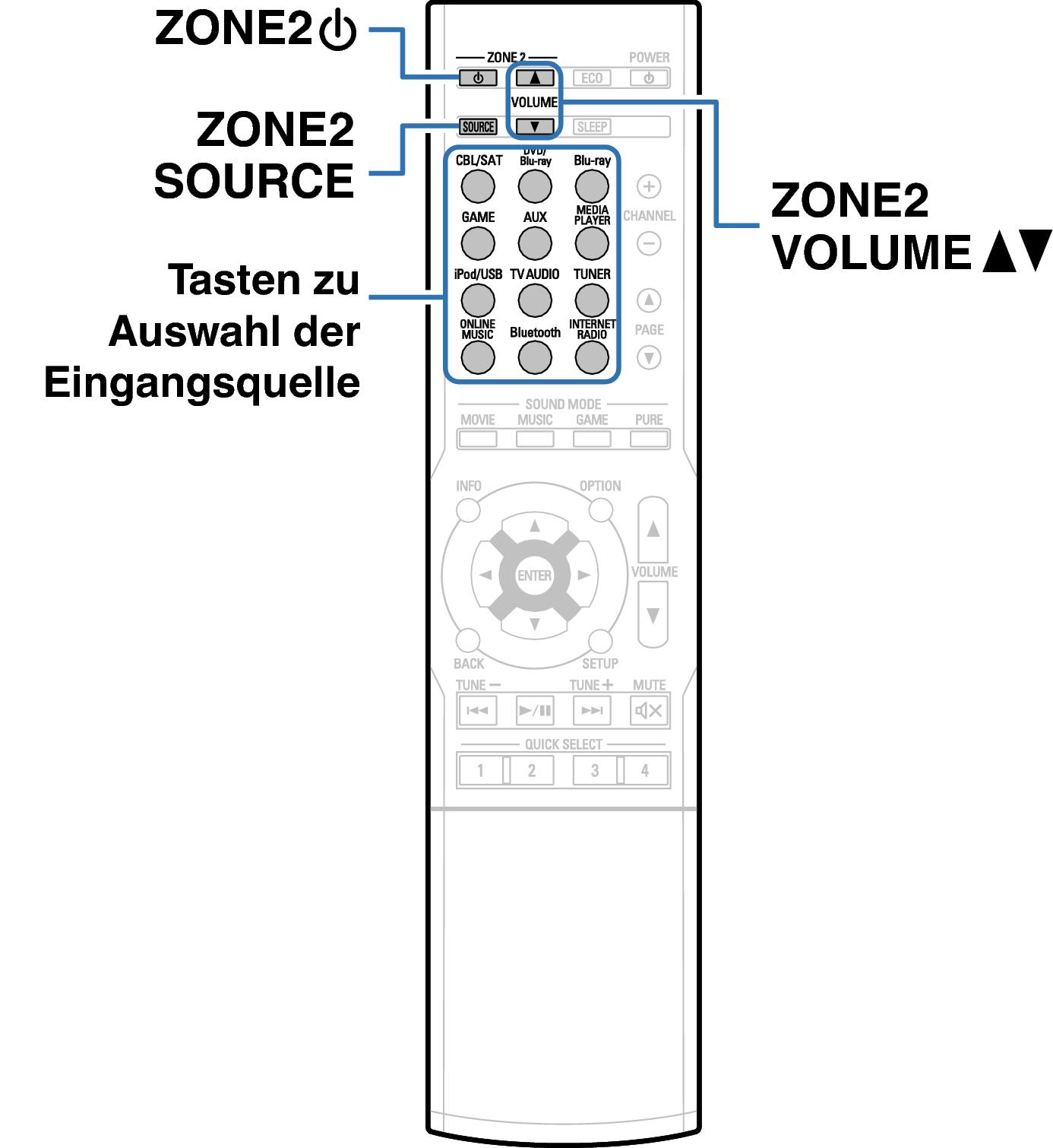 Drücken Sie ZONE2 SOURCE, um die Eingangsquelle für die Wiedergabe auszuwählen.