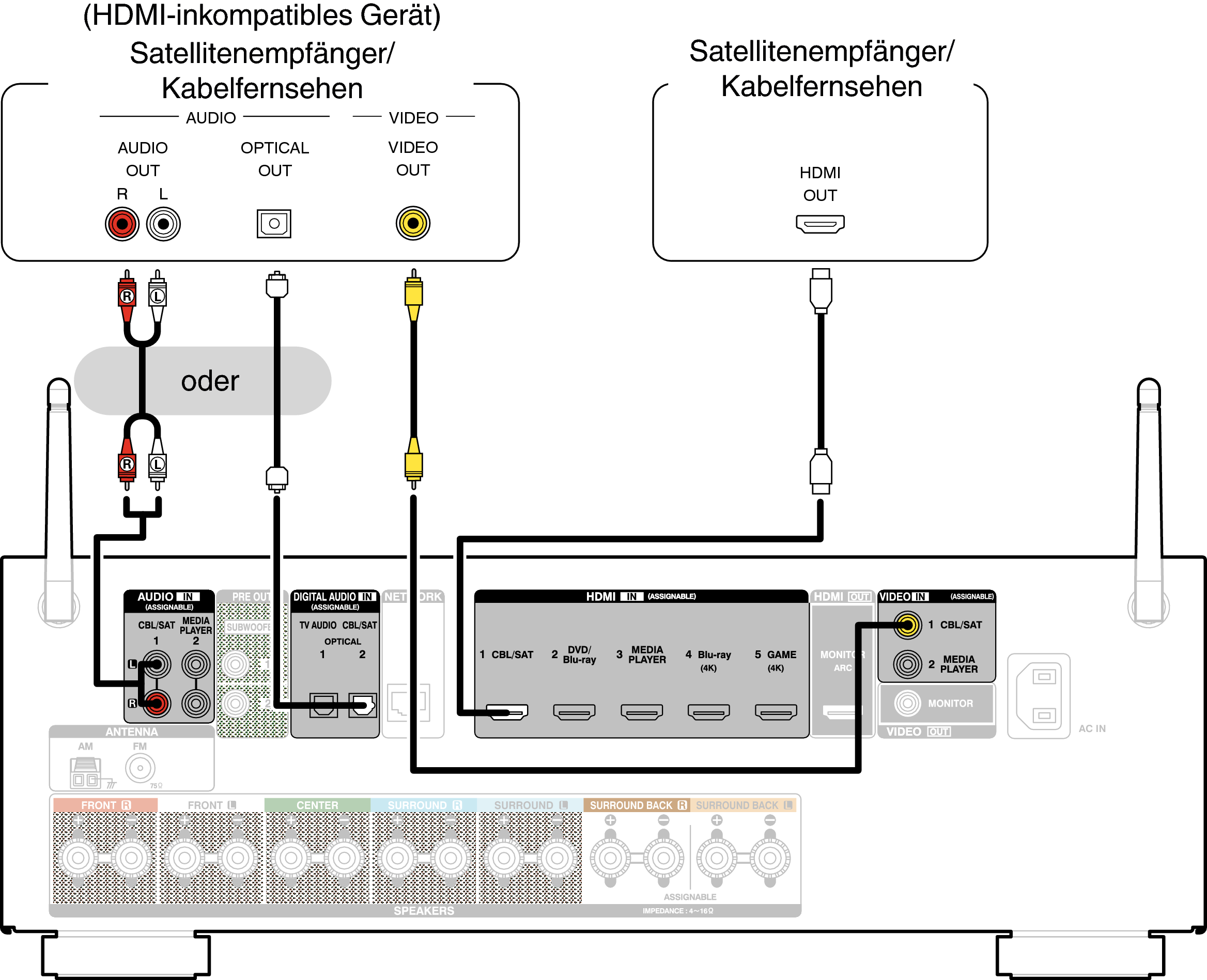 In diesem Beispiel wird der Anschluss einer Satellitenempfänger-/Kabelfernsehen-STB erläutert.