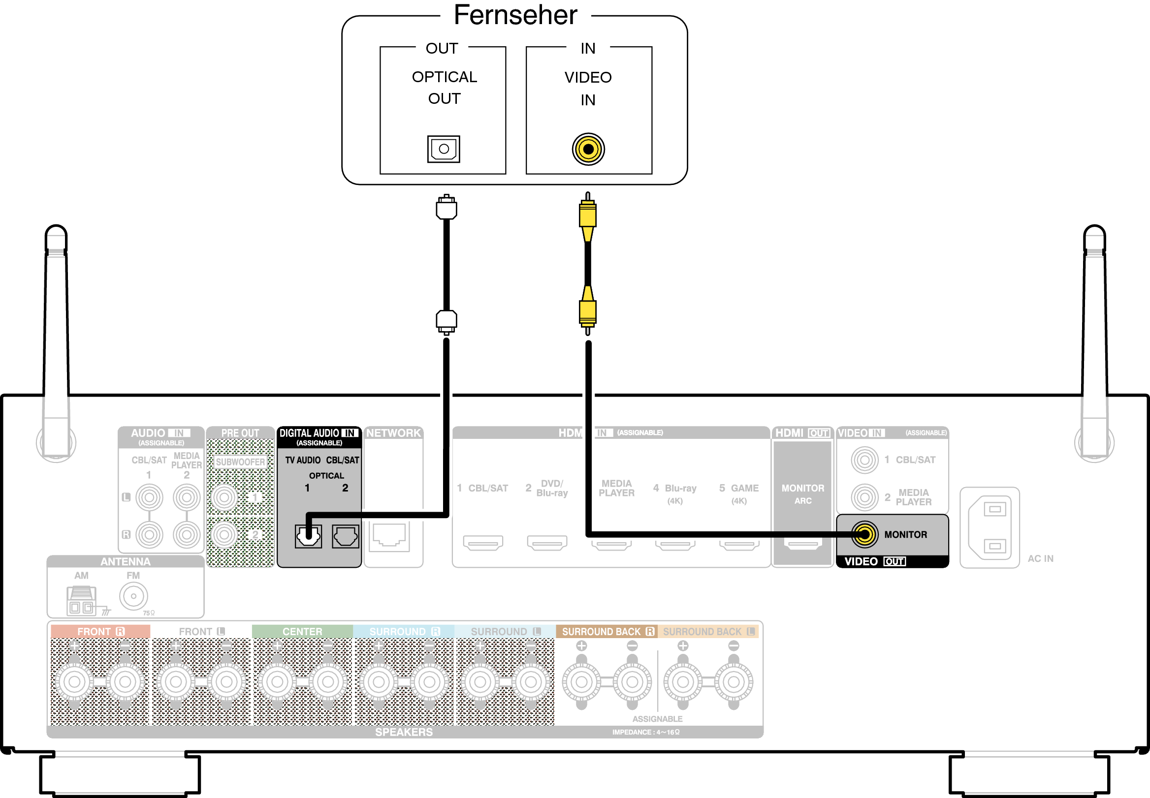 Um Audio des Fernsehers auf diesem Gerät wiederzugeben, schließen Sie den Fernseher über ein optisches Kabel an dieses Gerät an.