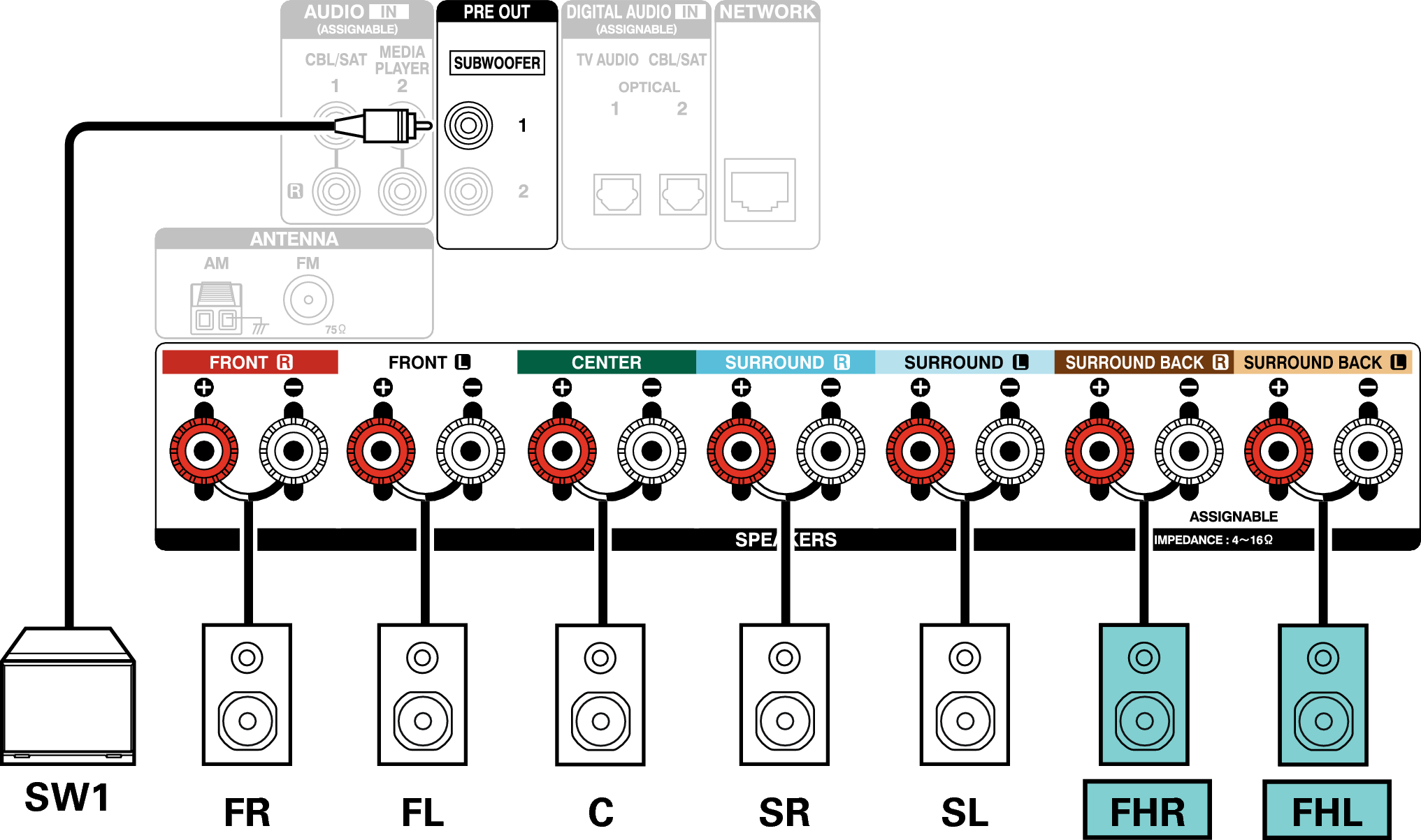 Wenn Sie nur einen Surround-Back-Lautsprecher verwenden, schließen Sie ihn am Anschluss SURROUND BACK L an.