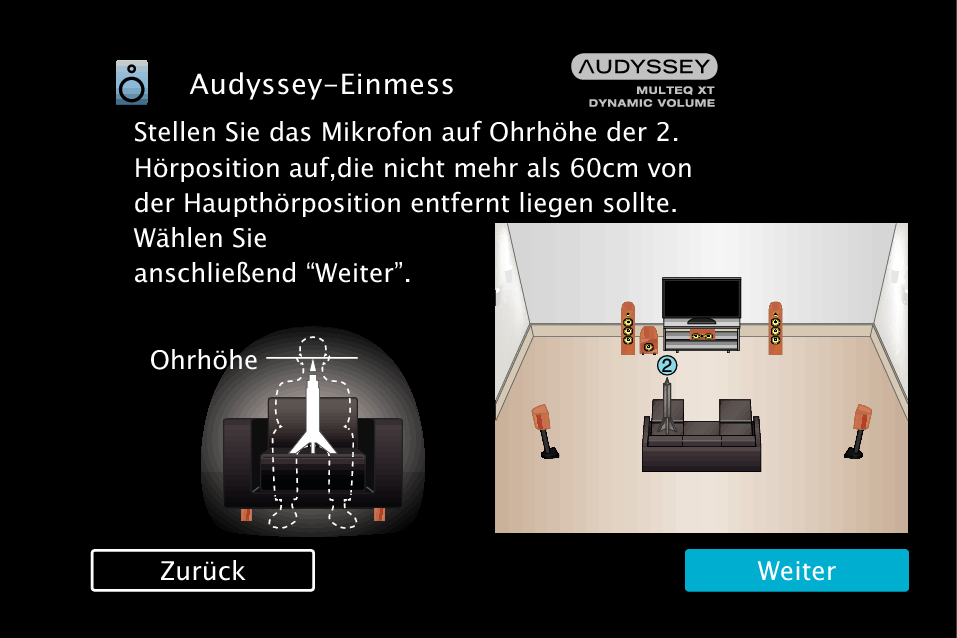 Wenn Sie das Mikrofon für die Klangkalibrierung aufstellen, richten Sie dessen Spitze zur Decke und stellen Sie die Höhe so ein, dass es sich in der Höhe der Ohren eines sitzenden Zuhörers befindet.
