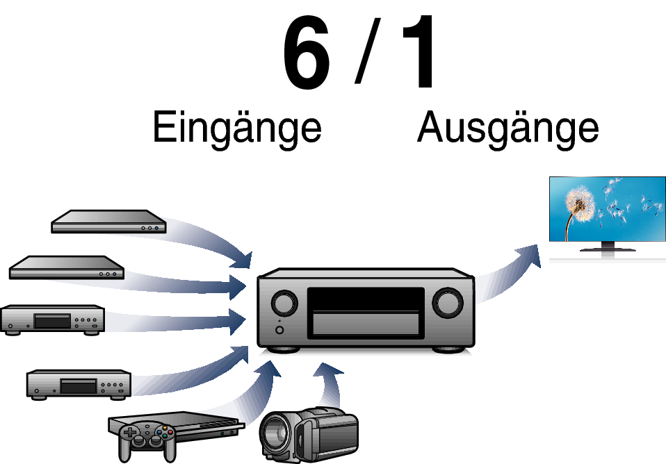 Dieses Gerät verfügt über 6 HDMI-Eingänge und 1 HDMI-Ausgänge, die Verbindungen mit verschiedenen HDMI-kompatiblen Geräten wie Blu-ray Disc-Playern, Spielekonsolen und HD-Videokameras ermöglichen.