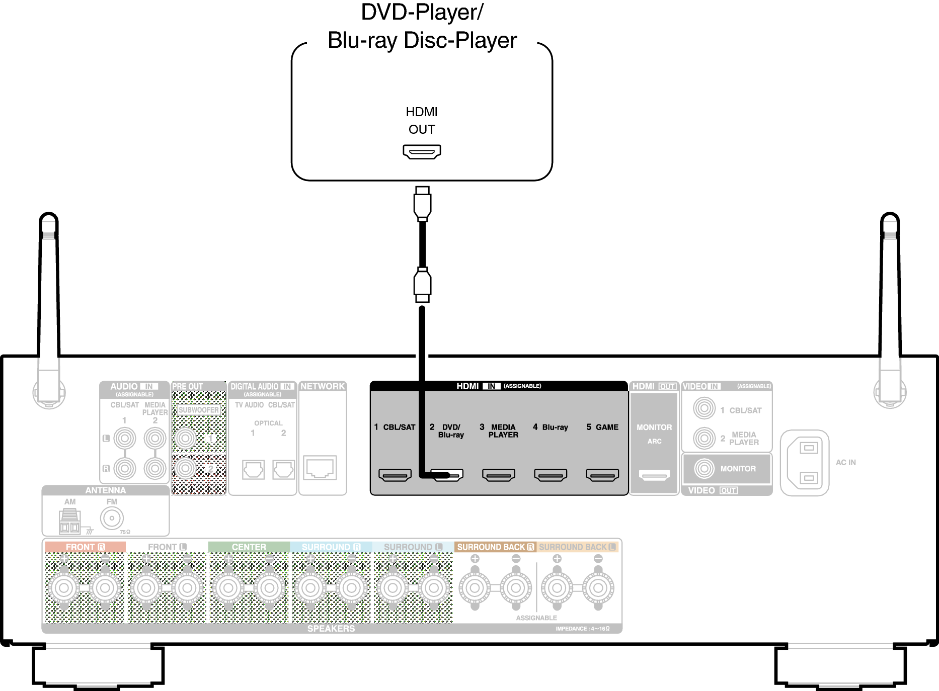 In diesem Beispiel wird der Anschluss eines DVD-Players oder Blu-ray Disc-Players erläutert.