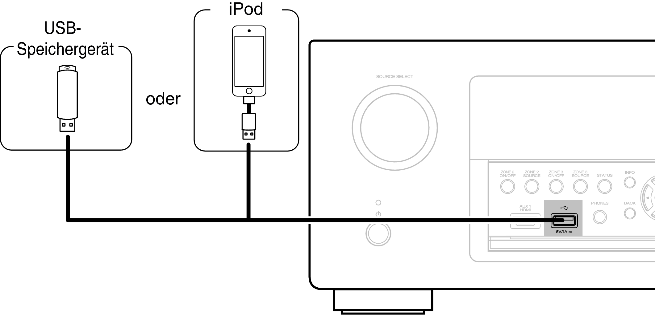 Denon kann nicht garantieren, dass alle USB-Speicher verwendet oder mit Strom versorgt werden können. Wenn Sie ein mobiles USB-Festplattenlaufwerk verwenden, das über einen Netzadapter verfügt, verwenden Sie diesen.
