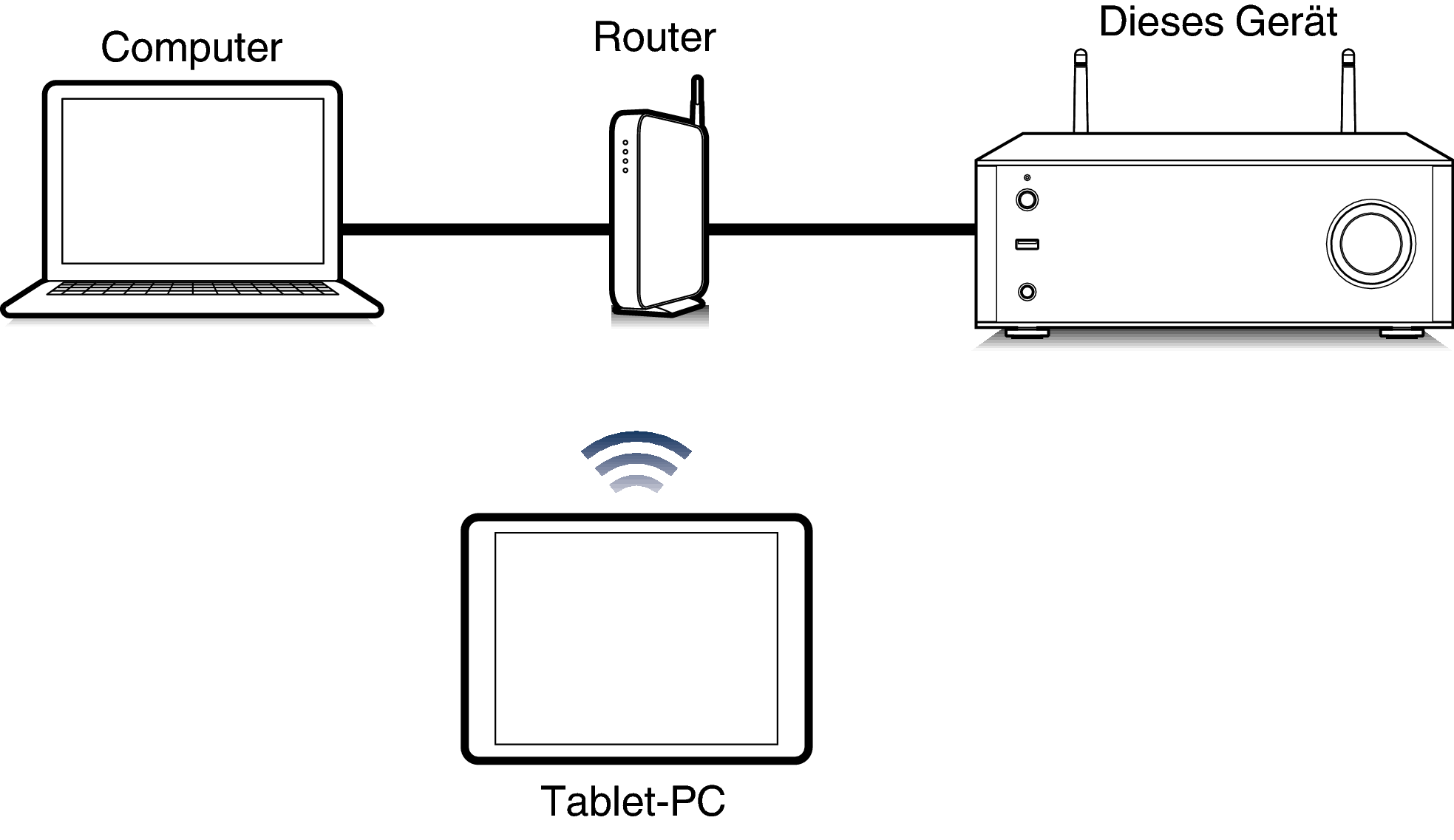 Dieses Gerät und der Computer oder das Tablet müssen ordnungsgemäß mit einem Netzwerk verbunden sein, um die Netzwerk-Steuerfunktion verwenden zu können. Anschließen an ein Heim-Netzwerk (LAN)Link